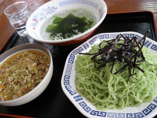 緑黄色野菜を練り込んだ、緑色の手打ち麺。