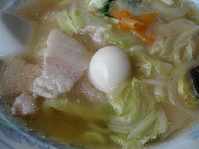 炒めた肉や野菜の具をのせた塩味のラーメンです。