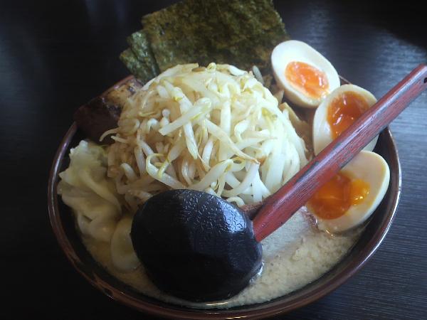 もやし、味玉1.5個、角煮、チャーシュー、ワンタン(餃子?)と