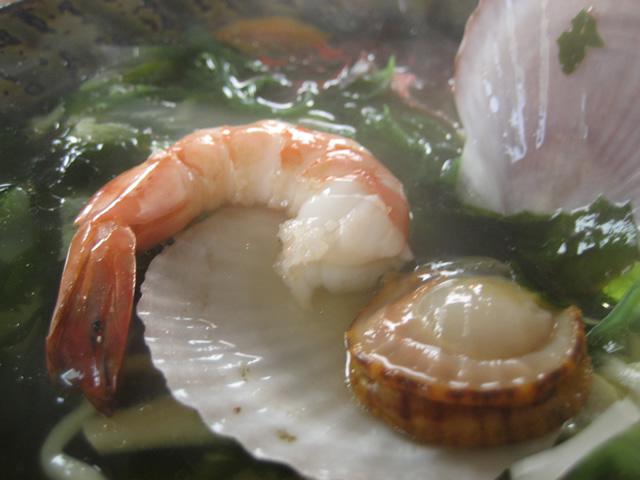 新庄市鳥越「海草ラーメン」の人気メニュー《浜っ子一番》は、ホタテやエビも入ったあっさり海草しおラーメンです。
