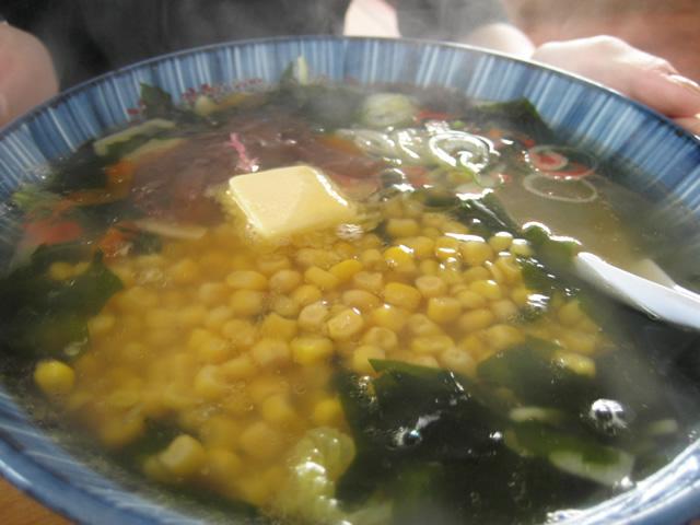 海草しおラーメンに、バターとコーンのトッピングも人気の品。