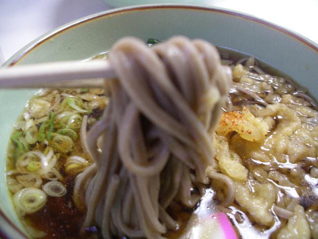 この写真はたぬき蕎麦です。太めのモチモチした食感の蕎麦です。蕎麦の他にもむぎきりが味わえます。