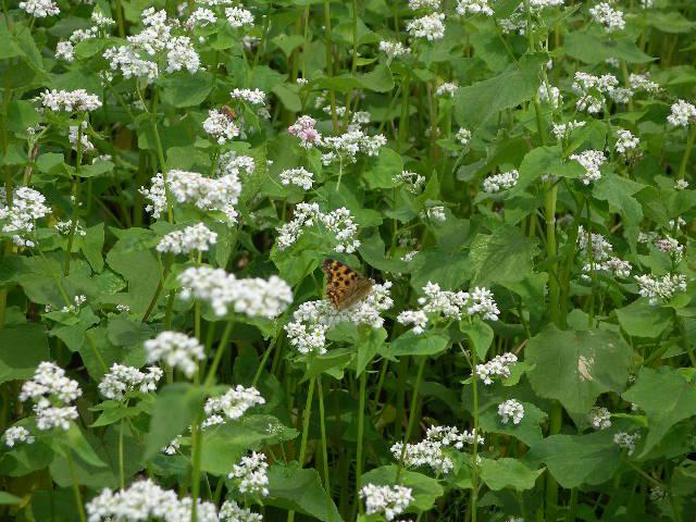 蕎麦の花が満開です。蝶々が花にとまっていました。