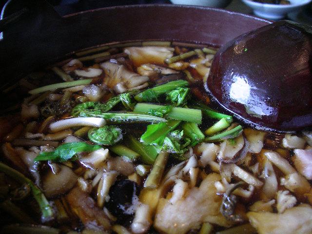 だしの効いたお醤油味の熱々のスープです。まるいお鍋に沢山の山菜と鳥が入ってます!