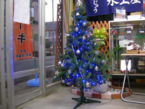 今流行の青色LEDのみを使ってクールなイメージで飾ったクリスマスツリーです。お店の入り口にトナカイ。お店の中にはイルミネーションが光る