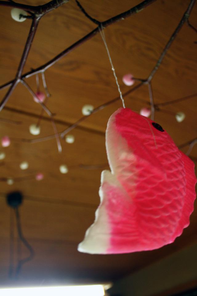 ヤマザワでこのあいだ買ってきた、ピンクとしろのかわいいお団子と、鯛をさげて、完成★