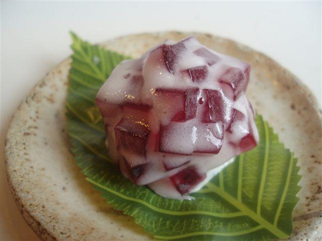 あじさいは、あずきあんを白あんで包み、赤い所は山ぶどうの錦玉です。無着色の天然の色です。それを淡雪でてんぷらしたものだそうです。