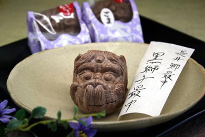長井市の各地区の神社に伝わる黒獅子をかたちどった、うす黒い最中です。