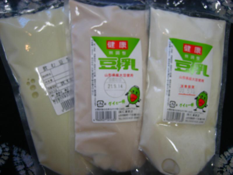 山形県産大豆の豆乳のほかに、秘伝大豆の豆乳、川西町産紅大豆の豆乳と3種類あります。