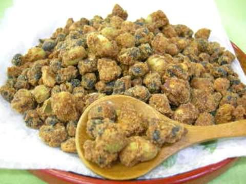 煎った青大豆、黒大豆を黒糖と三温糖の黒糖蜜でまびったお菓子。