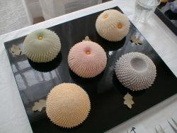 工芸菓子の競作と上生菓子12ヶ月(60種)、上生菓子昔話48種、盆景菓子、三つ盛折り箱等々和菓子の技法を活かし、季節の情感や風情を表した展示となっております。