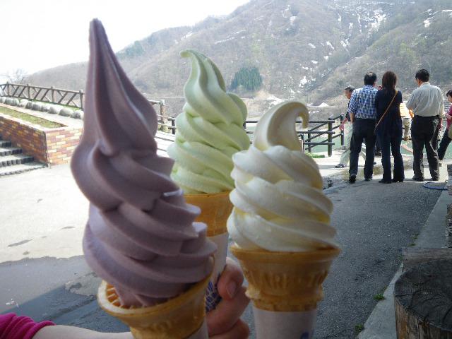 山ぶどうソフト、ずんだソフト(枝豆)、バニラソフトの3本。