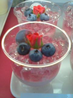 フランボワーズのムースにブルーベリーゼリーを刻み、バラの花(食用です)を飾りました。