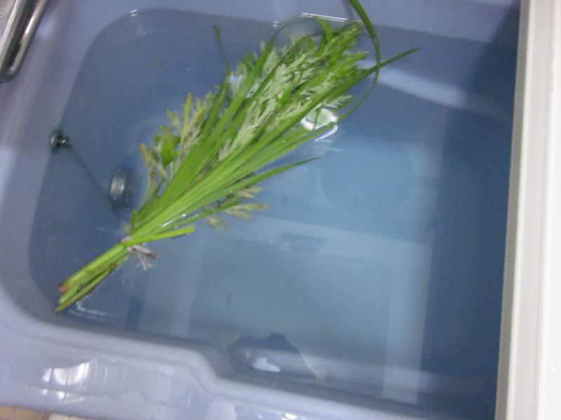 菖蒲と蓬を束ねて、屋根に上げ、また、菖蒲湯に浸かって英気を養います。