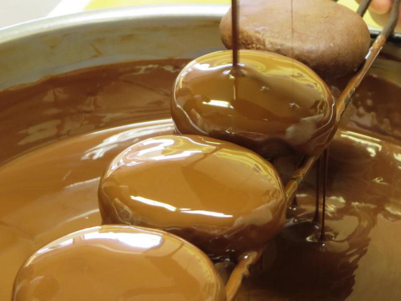 ♪あれがあなたの好きな場所、港の見下ろせる小高い公園・・・といえばオフコースの名曲ですが、ここ数日の朝晩の冷え込みは秋の気配全開という感じですね。そのせいか、いつもは5時半頃から混み出す朝市も、今朝は6時の花火の前ぐらいから混み出したようです。 さて、季節の移ろいとともに、お菓子も段々冬支度です。今日はチョコレート饅頭の今シーズン初焼きです。柔らかい白あんをココア生地で包んで焼き上げ、更にとろ〜りチョコレートをコーティングして出・来・上・が・り・・・とても手間のかかる美味しいお菓子です。ファンの方が多い、人気商品でもあります。どうぞ一度ご賞味あれ!!!写真はあんを包んで成型したところ、オーブンから焼きあがった直後、そして冷めてからのチョコレートコーティング風景です。