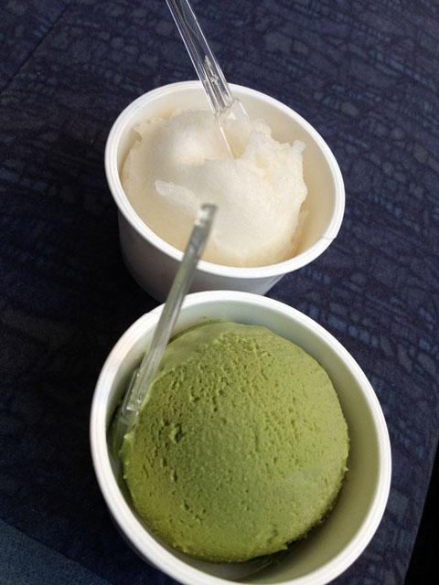 山形大医学部近辺、桜田南にある「自家焙煎珈琲とジェラートの店チャオ」の駅前店。手作りジェラートシングルの「抹茶」「季節のフルーツ(ラ・フランス)」。濃厚で大人な味わいを楽しめます。