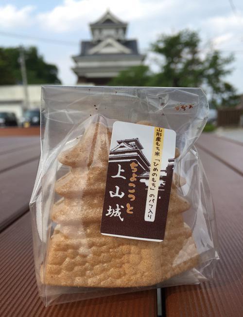 かみのやま温泉駅前の「だんご本舗たかはしさん」の上山城の形をした最中の中にはぎっしり山形産もち米「ひめのもち」のパフ入りチョコレート〜♪食べごたえ抜群ですよ。本物の上山城をバックにおやつタイム...。