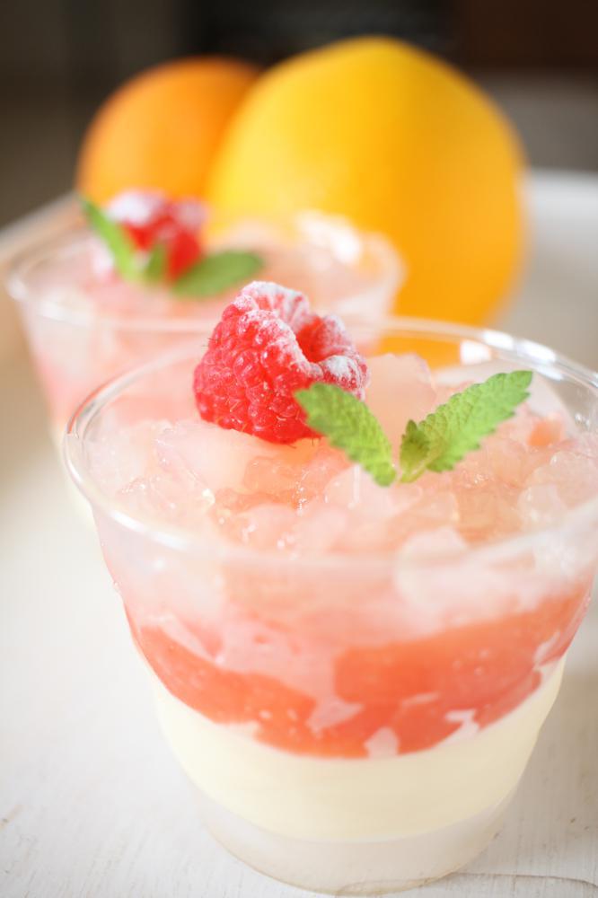暑い日にはぴったりの、とても爽やかなスウィーツですパッションムースに、ブラッドオレンジゼリー・レモンゼリーの三層になっており、是非上からスプーンで一緒に召し上がってみてください。ちょっと酸味の効いた柑橘系のフルーツが、爽やかな気持ちにさせてくれますよ(^^)