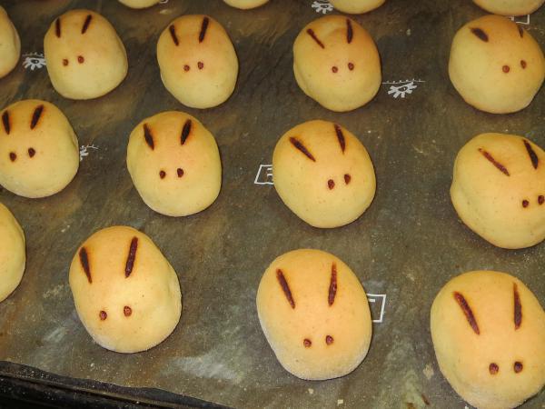 今年の夏は気象庁の予測どおり厳しい暑さでした残暑も長く厳しいそうですが、何とかこの予想は外れてほしいものです。さすがにここ数日は、秋の気配というか日中も過ごしやすさが感じられるようになってきて、加熱工程の多い菓子製造の作業にも何とかやる気が出てきました。写真は「菊ウサギ」の製造工程です。広島産無農薬レモンの果皮を摩り下ろし、果汁と合わせて白あんに練りこみ、南陽産の菊花を散らして中餡を作ります。バター、砂糖、卵、小麦粉等で作った皮生地でレモン餡を包餡し、焼成します。焼きあがったらすぐに焼きゴテで目と耳を付けてうさぎに見立てます。包装して熊野大社様でご祈祷していただいた御縁玉などと一緒に箱に入れ仕上げます。「三羽のうさぎ」の幸せが詰まったお土産として飛ぶように売れていきます(笑)
