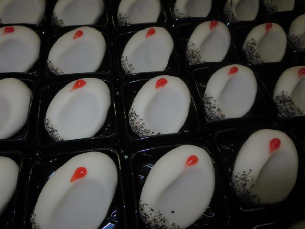 今日からは餅・モチ・もち・・・のオンパレードで、餅のお客様の合間を見て生菓子つくりです。昨日と同じ練りきりで、丹頂の朱羊羹がアクセントの「つる」です。尾羽はすりごまで表現しています。これで当店の新年の生菓子6種類そろい踏みです。時間がないのでざっと説明すると、抹茶きんとん製「松の雪」、高麗しぐれ製「初日」、うぐいす鹿の子「水仙」、栗かのこ「紅梅白梅」、あとは練りきりの「福寿扇」と「鶴」です。行き届かないことも多々ありましたが、泣いても笑ってもあと一日です。明日もがんばります。皆様も悔いのない一日を過ごされ、どうぞ良い年をお迎えください。一年間のご愛顧・ご愛読ありがとうございました。