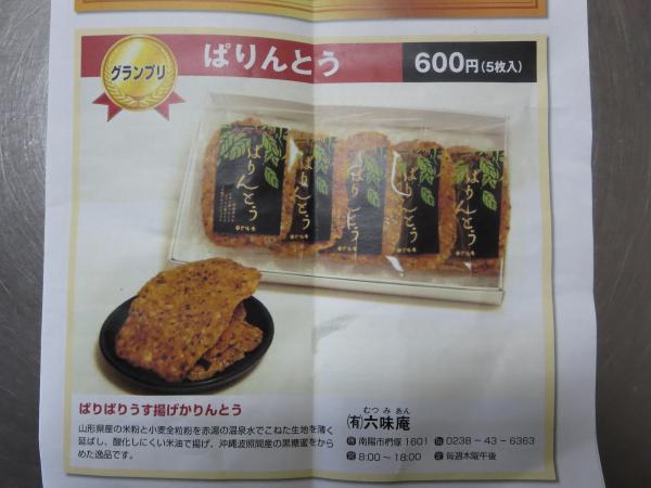 本日の市報で配布された、商工会の28年度一店逸品事業でウチの「ぱりんとう」が見事グランプリに輝きましたパチパチパチまさかコンクール形式だとは思ってなかったのでビックリでした。このチラシで、今回の応募事業者や商品が始めて分かりました。自分的には、パラグライダー体験や、南陽産の一味唐辛子、屋根融雪のスーパーR、そして文進堂さんの金箔プリント(高そうだけど)等が へぇーっと興味をそそられました。何はともあれ、南陽から他所へのお土産は、しばらくの間、「ぱりんとう」ということで、宜しくお願いいたします。