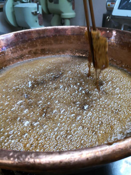 毎日暑い猛暑の日々、いかがお過ごしでしょうか。私も療養中とはいえ、1か月も寝てるとさすがに家人の対応もつっけんどんになり、臨界点間近という感じでしょうか。渋々起きだし、仕事しだしたのはいいのですが、クーラーの効いた部屋で横になってた殿様生活から見ると、仕事場は体感45度(蒸気・油・あん練り・オーブンの四重奏の時は50度越えザラです)の地獄そのもの。今日はかりんとうの蜜かけで、グツグツ106度程度で煮立つシロップに1枚1枚はしで丁寧にくぐします。最初は地獄のようだったのが、しばらくすると慣れてきて、むしろ久々に汗みずくで仕事をするのが快感に代わってきます。そんな思いで作ってるかりんとう。夏もおいしい逸品です。