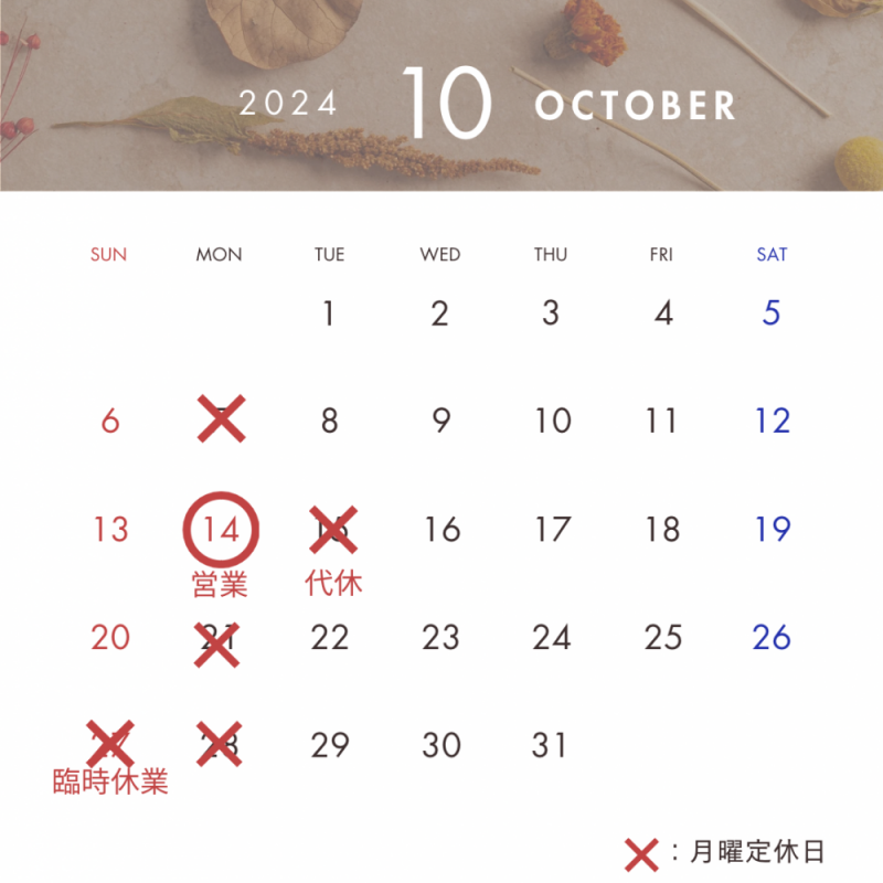 OPEN 10:00CLOSE 18:00(LAST ORDER 17:50)14日(祝)は営業いたします15(火)は代休となります27(日)は臨時休業となります皆さまのご来店をお待ちしております
