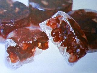 琥珀糖(寒天と砂糖を煮詰めて、冷やし固めたもの)で包みました。