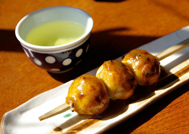 山形市山寺、お休み処対面石の「芭蕉焼だんご(えごま)」です。