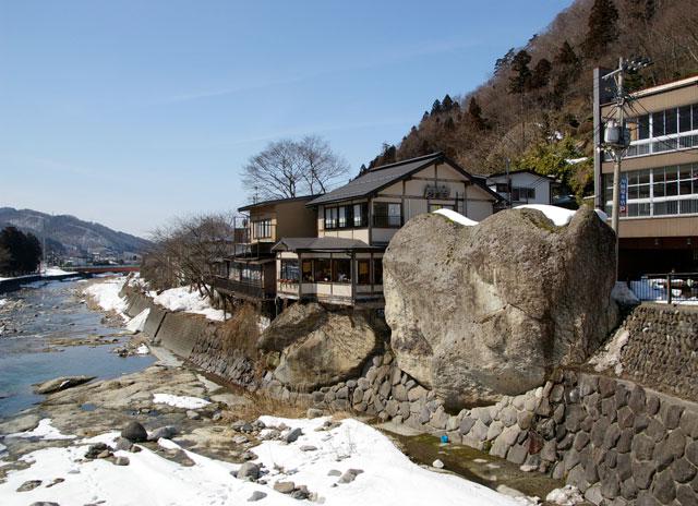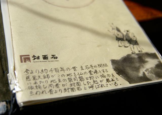 今より約千百年の昔、立石寺の開祖慈覚大使がこの地を仏の霊場とするにあたり、地主の磐司磐三郎に協力を依頼し、両者が対面した処が岩上と云われ、昔より対面石と呼ばれている。