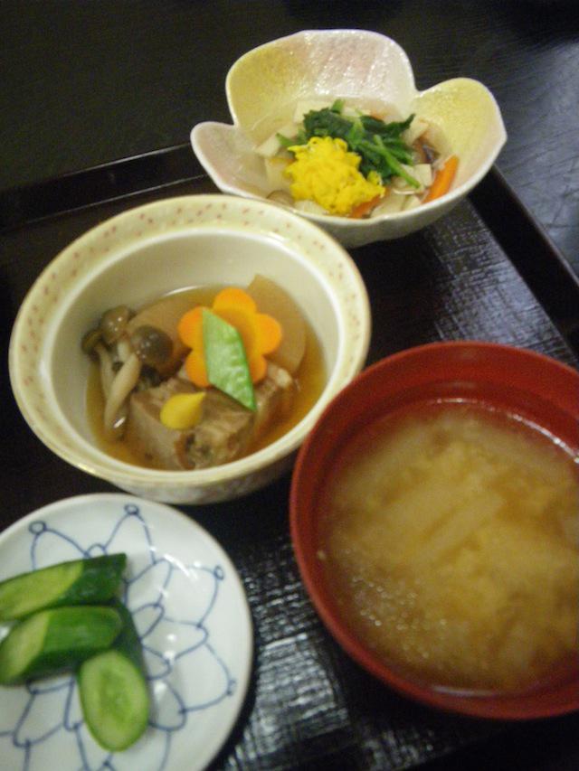 豚汁やお吸い物や煮浸し、お新香、刺身が付きます。