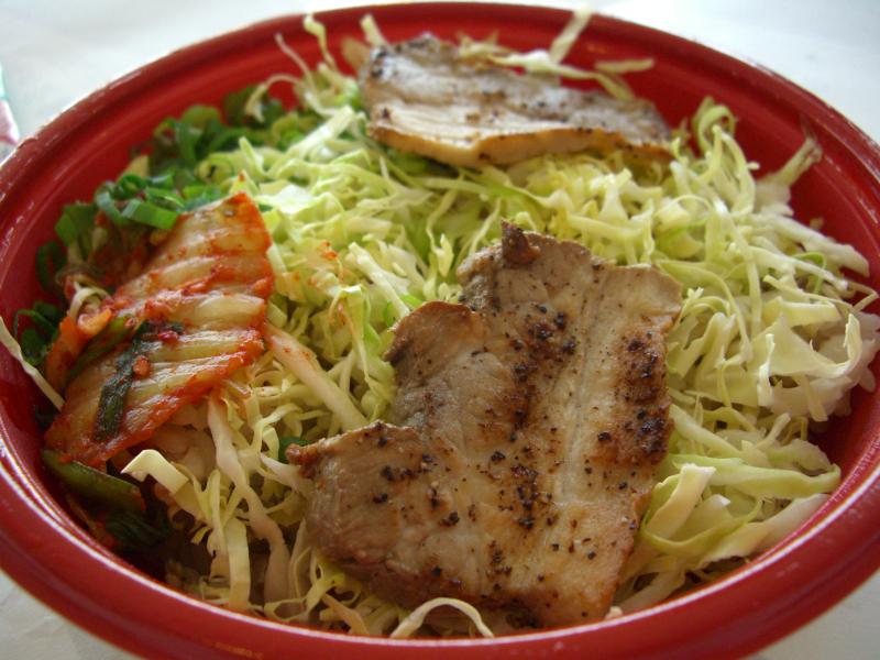 細かいチャーチューとゴマを混ぜ込んだごはんに、キャベツとネギ、キムチ