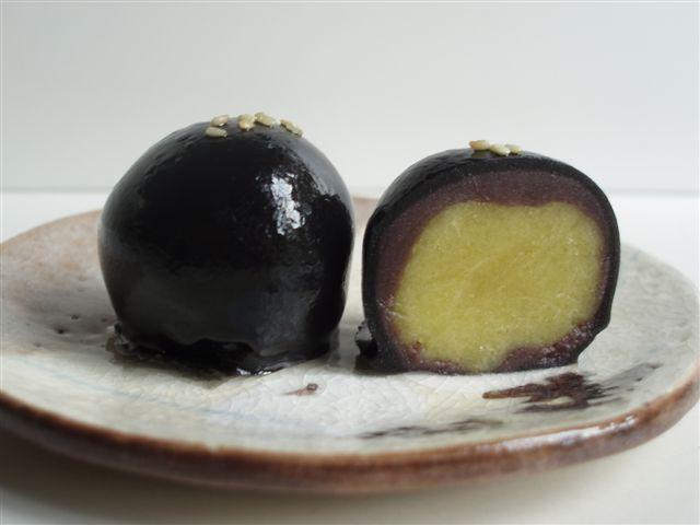 さつま芋の餡を小豆餡で包み、胡麻羊羹を掛けてみました。