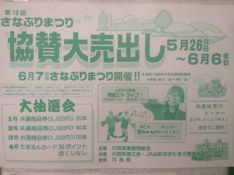 6月7日(土) 川西町中央公民館にてさなぶりまつり開催!川西のおいしい農産、加工品、焼き鳥、フランクフルトなど販売いたしますケーブルテレビNCVでおなじみの9ちゃんがやってくる!朝倉さやさんのライブは2回公演 1回目 AM11:30より 2回目 PM1:00よりお待ちしております♪