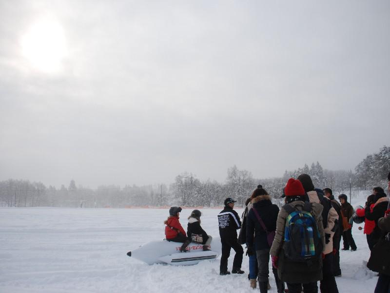 大勢なのでスノーモービルの説明はマイクを使っています!