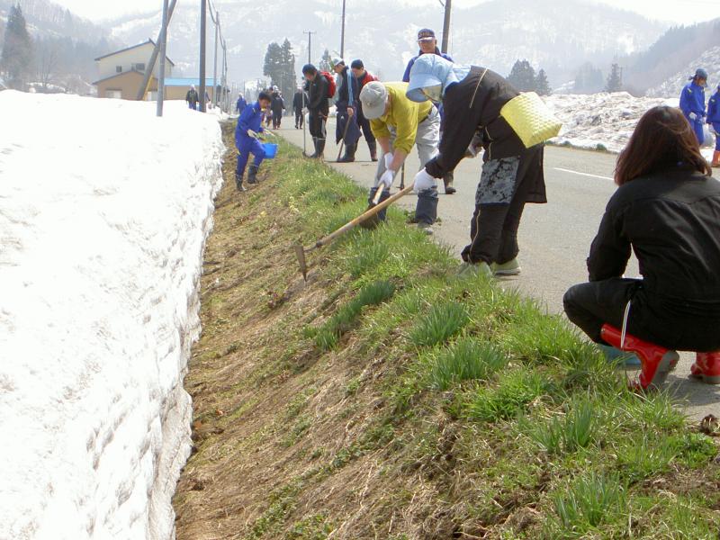周りはまだ雪が残るなか、小学生から、老人クラブの方まで約60名で草取りや肥料やりの作業で汗を流していました。