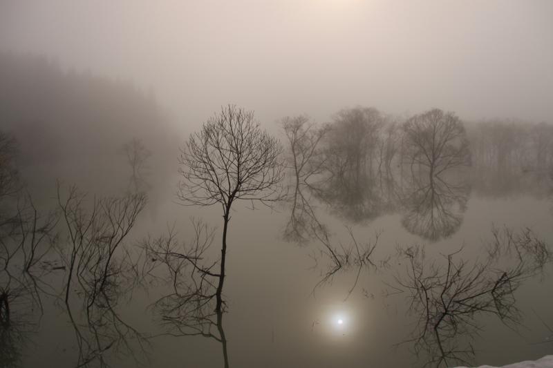 真っ白な朝霧にふんわり包まれた柳が湖面に浮かぶ風景は、さながら墨絵の世界。