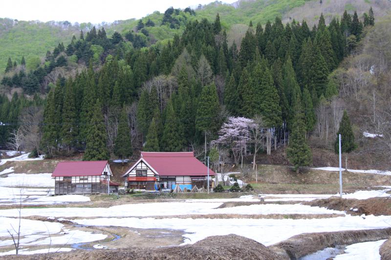 春本番。カメラマンは大忙し。残雪のなか、山々のブナが一斉に芽吹き、淡いピンクのオオヤマザクラが間もなく満開となります。向こう一週間の天気はまずまずのようです。連日、遠くからカメラマンの方々がお出でになります。早朝から夕暮れまで自分なりのポイントにめがけてお出かけになります。