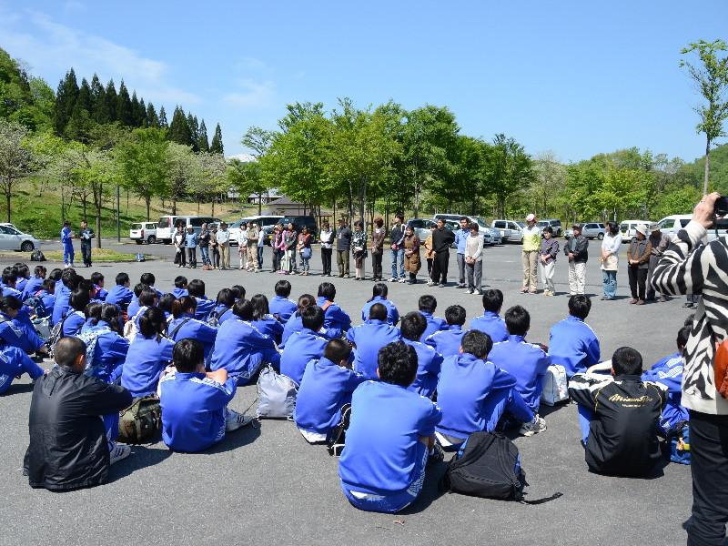 飯山満中学校の皆さんが到着して、対面式です。お世話になる各農家民宿のお父さんお母さん方と顔合わせですね!