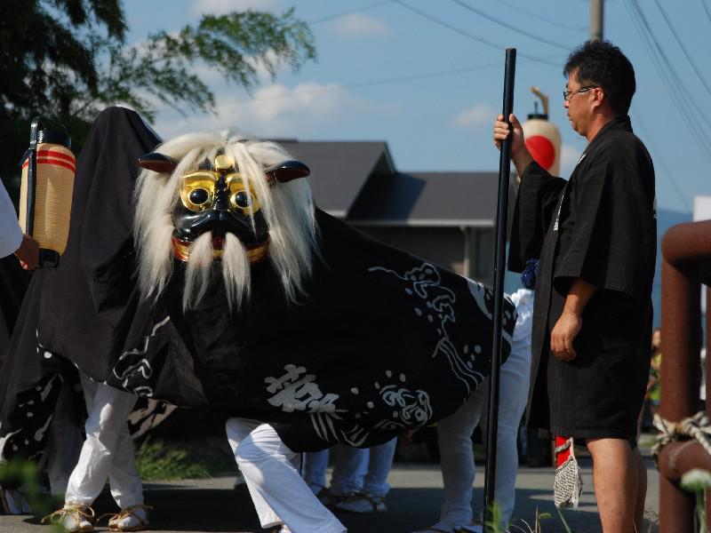 この神社の警護と獅子の掛かりは、かなり低い位置まで腰を下げ、ゆっくりと掛け声をかけながら一気に勝負に持っていくという流れが特徴です。見守る人も真剣