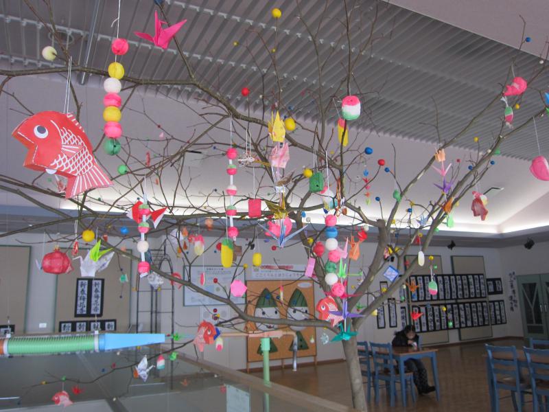物産館2階に、小正月行事の団子の木飾りをしました!!