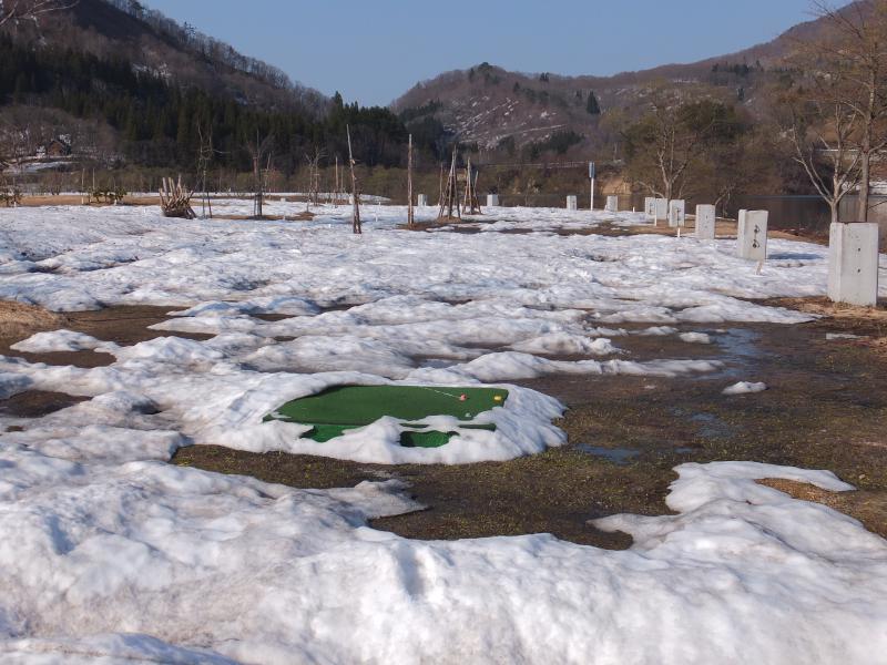 21日の朝方の積雪にはビックリ。あわててスタットレスタイヤに履き替えた人も多かったとか。ようやく平年の温かさが戻ってきました。今日も融雪がずいぶん進み、残り30cmまでにこぎつけました。パークゴルフコースも地面があっちこっち顔を出し始めました。もう少しの辛抱かな。