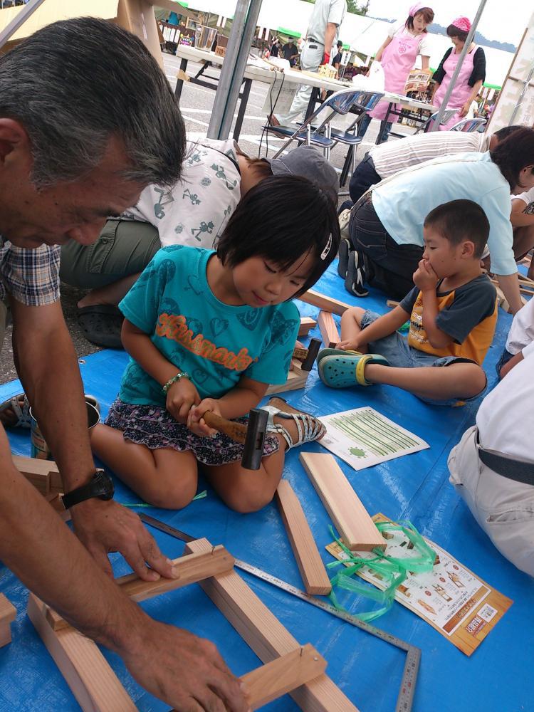 先日、めざみの里祭りで木工教室がありました。三女がどうしてもやってみたいという事で参加!飯豊産の杉の木で椅子をつくります。こういうの不得意!どう組み立てるのか悩んでいたら・・・救世主現る!!!!見ず知らずのおじさん!手取り足取りやさしく教えていただきました。どこのどなたか存じませんが、本当にありがとうございます。最後に「置賜木」の焼印を押してもらって完成!!仲良しAちゃんと記念撮影。