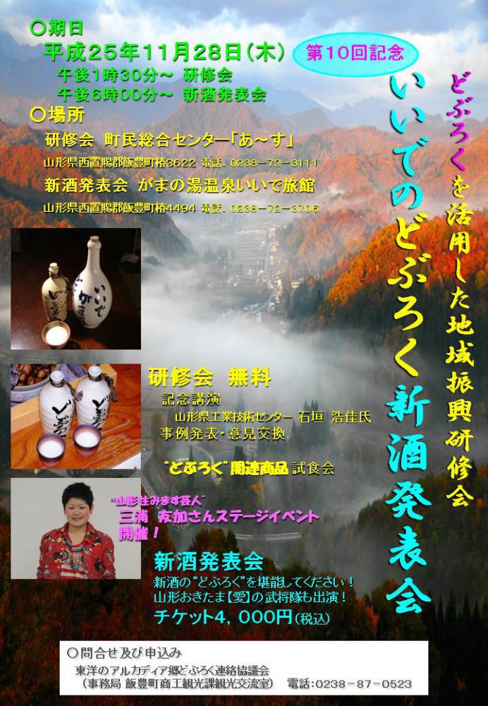 どうも、ノリです(*゚▽゚)ノ 今年もあの時期になってきましたね! そうです! どぶろくの新酒発表会です! 飯豊町内の杜氏達が丹精込めて仕込んだどぶろくがついに出来上がります!それに先駆けて先行試飲会が開催されますよ〜o(*^▽^*)o と〜っても楽しみですね(>▽<) 詳しい内容は↓から♪ 第10回いいでのどぶろく新酒発表会 ■日時 平成25年11月28日(木) 研修会 13:30〜会場 町民研修センター「あ〜す」 新酒発表会 18:00〜会場 がまの湯温泉いいで旅館 会場の移動にはバスが出ますよ〜 ■料金 ・研修会 無料・新酒発表会 料金お1人様 4.000円 ■お問い合わせ先東洋のアルカディア郷どぶろく連絡協議事務局п@0238-87-0523 今年はステージイベントとして研修会では山形住みます芸人として有名な「三浦友加」さんがステージイベントを行いますよ(* ̄0 ̄) そしてなんと、新酒発表会では山形おきたま【愛】の武将隊が出演します(;゚Д゚)! 先日のJTBの研修旅行でも迫力の演舞を披露したあの武将隊が出演しますよ!! 皆様、出来たてのどぶろくを味わえるチャンスですo(^▽^)o是非この機会にどぶろくを一足先に味わってみてくださいね(* ̄ー ̄*) 以上、ノリでした(≧▽≦)ツイート!function(d,s,id){var js,fjs=d.getElementsByTagName(s)[0],p=/^http:/.test(d.location)?'http':'https';if(!d.getElementById(id)){js=d.createElement(s);js.id=id;js.src=p+'://platform.twitter.com/widgets.js';fjs.parentNode.insertBefore(js,fjs);}}(document, 'script', 'twitter-wjs');