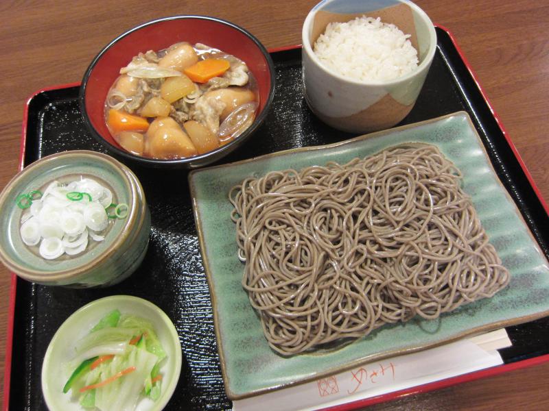 山形名物「いも煮」と皿そばとごはん、漬物が付いて