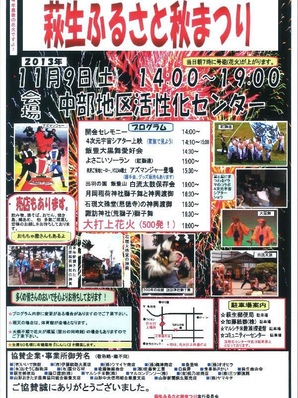 こんにちは、ノリです(^O^) 天気予報によると飯豊町は来週初雪が降るそうで((((;゚Д゚))))とーっても寒い日が続きそうですね・・・皆様防寒対策をしっかりして風邪等引かないように注意しましょう! またインフルエンザの季節でもあります。皆様手洗いうがいや予防接種等予防をばっちりして行きましょう♪ さて、そんな寒さも吹き飛ばす様なイベントがございます♪ 萩生ふるさと秋まつり 日にちは明日、11月9日ですよー(^◇^)時間帯は14時〜19時と遅めです。会場は中部地区活性化センターでございます。 ・・・告知の方かなり遅れてしまいました(-_-;)申し訳ありませんでした・・・ イベント内容はかなーり様々ありまして 紅獅連のソーラン節や白流太鼓 アズマンジャーショーや神輿渡御 諏訪神社の獅子舞 そして最後に大打上花火(500発) と目白押しです♪ 屋台や売店もあるので買い食いもオッケーです笑 当日は朝七時に号砲が上がりますのでお聞き逃し無いようにおねがいしますねー また、自動車は萩郵便局や加藤紙器等まわりに駐車場がありますのでそちらの方にお願いします♪ 以上ノリでした(^−^)Tweet!function(d,s,id){var js,fjs=d.getElementsByTagName(s)[0],p=/^http:/.test(d.location)?'http':'https';if(!d.getElementById(id)){js=d.createElement(s);js.id=id;js.src=p+'://platform.twitter.com/widgets.js';fjs.parentNode.insertBefore(js,fjs);}}(document, 'script', 'twitter-wjs');