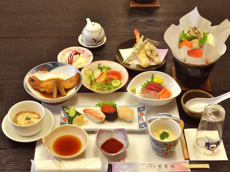 どうも、ノリです(^◇^) ノリのうんまい所紹介も第5弾となりましたヽ(=´▽`=)ノまだまだ紹介していくので、皆様気になったお店がありましたら是非、足を運んでみてくださいね〜♪ さて、今回紹介させて頂くお店は 四季彩 魚豊味さんです( ̄∇ ̄) 四季彩 魚豊味さんは、四季折々の魚介類をふんだんに使用した海鮮料理がうりの割烹料理店です♪ 残念な事にお一人様へのお食事の提供は行っておりません・・・(ノ△・。)泣予約制で基本的に4名様以上の団体予約が必要とのことです。是非、会食やお食事会等にご利用ください♪一食あたりの金額を提示して頂ければその値段に応じて様々なお食事を提供させて頂くとの事でした(*゚▽゚)ノ 店内は基本的に三つの部屋にわかれており、それぞれの部屋でお食事を堪能できるようになってますヽ( ̄▽ ̄)ノ 今回訪問させて頂いた時は大きな会食があり、襖をはずして大きな一つの部屋になってました♪このように臨機応変に様々な対応をしてくれるので皆様会食の時がありましたら魚豊味さんを利用して見るのはいかがでしょうか♪ お・・・美味しそう・・・ ( ̄ ̄*) お寿司に焼き物、揚げ物に鍋・・・刺身とたくさんあり過ぎて書き切れないです(笑)ちなみに今回は一食2000円の予算とのことでした♪ このクオリティの高さで2000円・・・凄いです∑('◇'*) 全ての料理に一流の技が使われているのが感じ取れますね(*^▽^*)職人技光ってます! それでは、頂きま〜す!・・・と行きたい所ですが(/□≦、)泣今回撮らせて頂いた写真は全て会食用とのことでしたので・・・残念です>< ですが、見ただけで美味しさが伝わってきますね!機会があれば是非頂きたいです!(*゚▽゚*) また、注文を頂ければお弁当もお作りするそうです! こちらも10個以上からの案内となりますが1つ800円〜からと非常にリーズナブルです(*^_^*)気軽に魚豊味さんの味を味わえるお弁当、是非一度会社等で注文してみるのはいかがでしょうか?(^∇^) そんな職人技が光る料理を味わえるお店はこちら↓ 〒:999-0602住所: 山形県西置賜郡飯豊町萩生4390-4TEL:0238-72-2109営業時間:昼夜予約制(時間帯も相談可)定休日:不定休 会食やお食事会の際、是非一度ご利用ください♪ 以上、ノリでした♪Tweet!function(d,s,id){var js,fjs=d.getElementsByTagName(s)[0],p=/^http:/.test(d.location)?'http':'https';if(!d.getElementById(id)){js=d.createElement(s);js.id=id;js.src=p+'://platform.twitter.com/widgets.js';fjs.parentNode.insertBefore(js,fjs);}}(document, 'script', 'twitter-wjs');