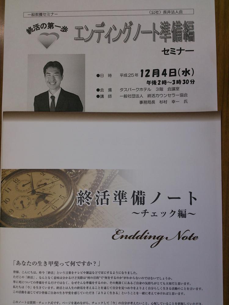 しゅうかつのセミナーに行って参りました。しゅうかつといっても、就職活動ではありませんよ!人生の終わりのための活動の「終活」です。皆さんも聞いた事あると思いますが「エンディングノート」の準備の仕方や考え方等でした。生前に葬儀・お墓等の事を決めておくものかな??くらいに思ってましたが初めのページに「人生の棚卸し」という今まで自分が生きてきたエピソードを年代ごとに書くものでした。ありがとうの出来事・お世話になった方・頑張ったことを書き出します。そして今までの人生を一文字で表すと?とありました。私は・・・思いつかないwww今までの人生を振り返り、これからの人生をいかにより良いものにしていくか!確認する為のきっかけになるノートでもあるな〜と思いました。皆さんも人生の棚卸し一度してみてはいかかでしょうか??