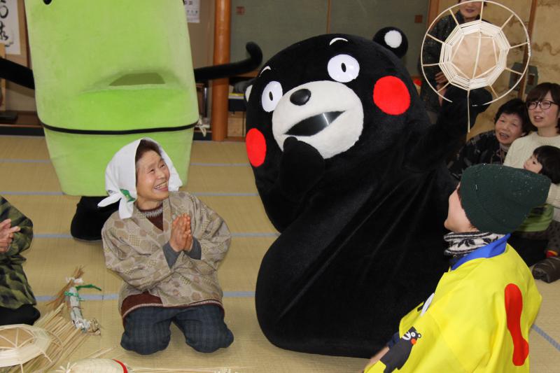今日午前中 中津川に人気キャラの クマモンとキテケロ君が揃ってやって来ました。花笠ばあちゃん達と一緒に 花笠作りをやってましたよー。