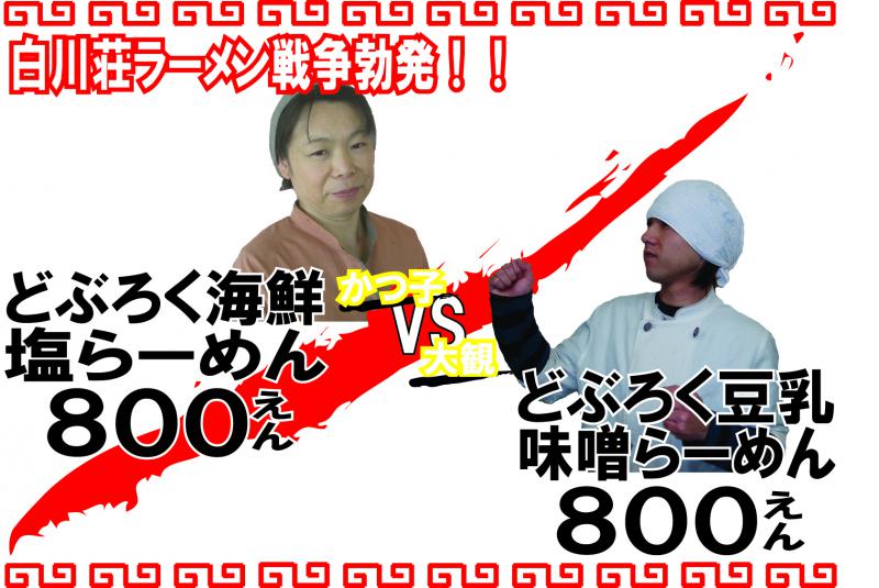 戦いはベテラン・後藤かつ子のどぶろく海鮮塩らーめんとVS新人・佐藤大観のどぶろく豆乳味噌らーめん。